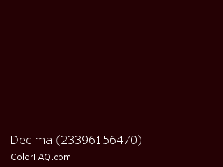 Decimal 23396156470 Color is a almost black red color and the nearest color is Sepia Black #2b0202. Hex code #250104 and RGB value is rgb(37,1,4). In RGB color space, this color is composed of 15% red, 0% green, 2% blue, In CMYK color space, this color is composed of 0% cyan, 97% magenta, 89% yellow , 85% black , In HSL color space, this color has a hue angle of 355° , 95% saturation and 7% lightness.