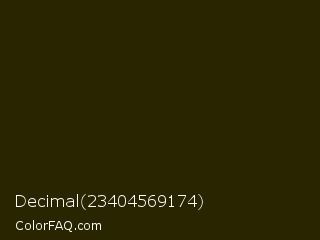 Decimal 23404569174 Color is a almost black yellow color and the nearest color is Jacko Bean #2e1905. Hex code #282500 and RGB value is rgb(40,37,0). In RGB color space, this color is composed of 16% red, 15% green, 0% blue, In CMYK color space, this color is composed of 0% cyan, 8% magenta, 100% yellow , 84% black , In HSL color space, this color has a hue angle of 56° , 100% saturation and 8% lightness.