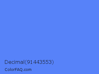 Decimal 91443553 Color is a light blue color and the nearest color is Blueberry #4f86f7. Hex code #5782f9 and RGB value is rgb(87,130,249). In RGB color space, this color is composed of 34% red, 51% green, 98% blue, In CMYK color space, this color is composed of 65% cyan, 48% magenta, 0% yellow , 2% black , In HSL color space, this color has a hue angle of 224° , 93% saturation and 66% lightness.