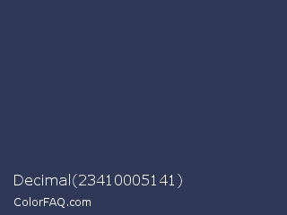 Decimal 23410005141 Color is a dark blue color and the nearest color is Martinique #363050. Hex code #303857 and RGB value is rgb(48,56,87). In RGB color space, this color is composed of 19% red, 22% green, 34% blue, In CMYK color space, this color is composed of 45% cyan, 36% magenta, 0% yellow , 66% black , In HSL color space, this color has a hue angle of 228° , 29% saturation and 26% lightness.