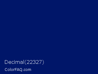 Decimal 22327 Color is a very dark blue color and the nearest color is Royal Blue #002366. Hex code #001669 and RGB value is rgb(0,22,105). In RGB color space, this color is composed of 0% red, 9% green, 41% blue, In CMYK color space, this color is composed of 100% cyan, 79% magenta, 0% yellow , 59% black , In HSL color space, this color has a hue angle of 227° , 100% saturation and 21% lightness.