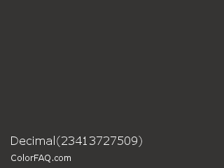 Decimal 23413727509 Color is a very dark orange color and the nearest color is Jet #343434. Hex code #353433 and RGB value is rgb(53,52,51). In RGB color space, this color is composed of 21% red, 20% green, 20% blue, In CMYK color space, this color is composed of 0% cyan, 2% magenta, 4% yellow , 79% black , In HSL color space, this color has a hue angle of 30° , 2% saturation and 20% lightness.