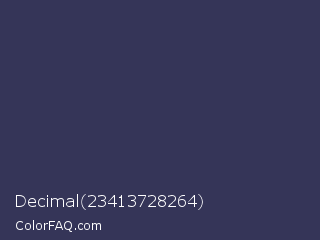 Decimal 23413728264 Color is a dark blue color and the nearest color is Martinique #363050. Hex code #353558 and RGB value is rgb(53,53,88). In RGB color space, this color is composed of 21% red, 21% green, 35% blue, In CMYK color space, this color is composed of 40% cyan, 40% magenta, 0% yellow , 65% black , In HSL color space, this color has a hue angle of 240° , 25% saturation and 28% lightness.