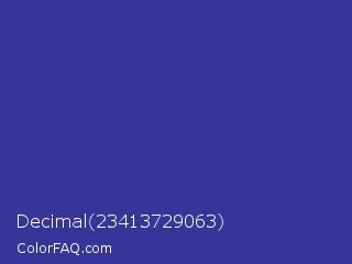 Decimal 23413729063 Color is a normal blue color and the nearest color is Blue Pigment #333399. Hex code #353697 and RGB value is rgb(53,54,151). In RGB color space, this color is composed of 21% red, 21% green, 59% blue, In CMYK color space, this color is composed of 65% cyan, 64% magenta, 0% yellow , 41% black , In HSL color space, this color has a hue angle of 239° , 48% saturation and 40% lightness.