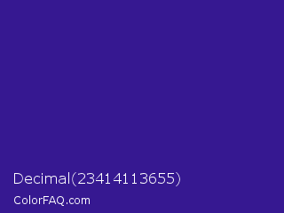 Decimal 23414113655 Color is a normal indigo color and the nearest color is Pixie Powder #391285. Hex code #361891 and RGB value is rgb(54,24,145). In RGB color space, this color is composed of 21% red, 9% green, 57% blue, In CMYK color space, this color is composed of 63% cyan, 83% magenta, 0% yellow , 43% black , In HSL color space, this color has a hue angle of 255° , 72% saturation and 33% lightness.