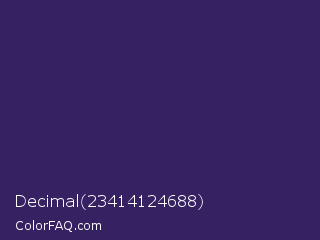Decimal 23414124688 Color is a dark indigo color and the nearest color is Jacarta #3a2a6a. Hex code #362262 and RGB value is rgb(54,34,98). In RGB color space, this color is composed of 21% red, 13% green, 38% blue, In CMYK color space, this color is composed of 45% cyan, 65% magenta, 0% yellow , 62% black , In HSL color space, this color has a hue angle of 259° , 48% saturation and 26% lightness.
