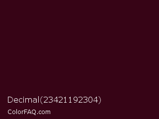 Decimal 23421192304 Color is a very dark rose color and the nearest color is Aubergine #3b0910. Hex code #370416 and RGB value is rgb(55,4,22). In RGB color space, this color is composed of 22% red, 2% green, 9% blue, In CMYK color space, this color is composed of 0% cyan, 93% magenta, 60% yellow , 78% black , In HSL color space, this color has a hue angle of 339° , 86% saturation and 12% lightness.