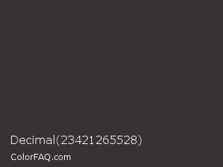 Decimal 23421265528 Color is a very dark magenta color and the nearest color is Tuatara #363534. Hex code #373236 and RGB value is rgb(55,50,54). In RGB color space, this color is composed of 22% red, 20% green, 21% blue, In CMYK color space, this color is composed of 0% cyan, 9% magenta, 2% yellow , 78% black , In HSL color space, this color has a hue angle of 312° , 5% saturation and 21% lightness.
