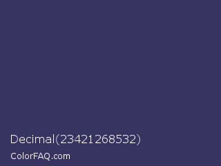Decimal 23421268532 Color is a dark indigo color and the nearest color is Deep Koamaru #333366. Hex code #373462 and RGB value is rgb(55,52,98). In RGB color space, this color is composed of 22% red, 20% green, 38% blue, In CMYK color space, this color is composed of 44% cyan, 47% magenta, 0% yellow , 62% black , In HSL color space, this color has a hue angle of 244° , 31% saturation and 29% lightness.