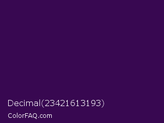 Decimal 23421613193 Color is a very dark purple color and the nearest color is Jagger #350e57. Hex code #380851 and RGB value is rgb(56,8,81). In RGB color space, this color is composed of 22% red, 3% green, 32% blue, In CMYK color space, this color is composed of 31% cyan, 90% magenta, 0% yellow , 68% black , In HSL color space, this color has a hue angle of 279° , 82% saturation and 17% lightness.