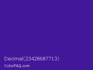 Decimal 23428687713 Color is a normal indigo color and the nearest color is Daisy Bush #4f2398. Hex code #421799 and RGB value is rgb(66,23,153). In RGB color space, this color is composed of 26% red, 9% green, 60% blue, In CMYK color space, this color is composed of 57% cyan, 85% magenta, 0% yellow , 40% black , In HSL color space, this color has a hue angle of 260° , 74% saturation and 35% lightness.