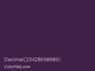 Decimal 23428698689 Color is a very dark purple color and the nearest color is Deep Grape #381a51. Hex code #422149 and RGB value is rgb(66,33,73). In RGB color space, this color is composed of 26% red, 13% green, 29% blue, In CMYK color space, this color is composed of 10% cyan, 55% magenta, 0% yellow , 71% black , In HSL color space, this color has a hue angle of 290° , 38% saturation and 21% lightness.
