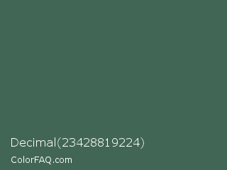 Decimal 23428819224 Color is a normal green color and the nearest color is Mineral Green #3f5d53. Hex code #426656 and RGB value is rgb(66,102,86). In RGB color space, this color is composed of 26% red, 40% green, 34% blue, In CMYK color space, this color is composed of 35% cyan, 0% magenta, 16% yellow , 60% black , In HSL color space, this color has a hue angle of 153° , 21% saturation and 33% lightness.