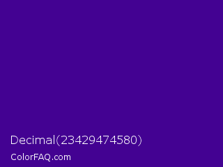 Decimal 23429474580 Color is a dark violet color and the nearest color is Pigment Indigo #4b0082. Hex code #430292 and RGB value is rgb(67,2,146). In RGB color space, this color is composed of 26% red, 1% green, 57% blue, In CMYK color space, this color is composed of 54% cyan, 99% magenta, 0% yellow , 43% black , In HSL color space, this color has a hue angle of 267° , 97% saturation and 29% lightness.