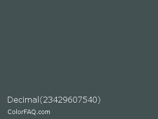 Decimal 23429607540 Color is a dark cyan color and the nearest color is Mako #444954. Hex code #435152 and RGB value is rgb(67,81,82). In RGB color space, this color is composed of 26% red, 32% green, 32% blue, In CMYK color space, this color is composed of 18% cyan, 1% magenta, 0% yellow , 68% black , In HSL color space, this color has a hue angle of 184° , 10% saturation and 29% lightness.