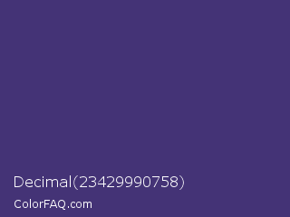 Decimal 23429990758 Color is a normal indigo color and the nearest color is Minsk #3f307f. Hex code #443376 and RGB value is rgb(68,51,118). In RGB color space, this color is composed of 27% red, 20% green, 46% blue, In CMYK color space, this color is composed of 42% cyan, 57% magenta, 0% yellow , 54% black , In HSL color space, this color has a hue angle of 255° , 40% saturation and 33% lightness.