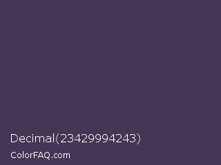 Decimal 23429994243 Color is a dark violet color and the nearest color is Gun Powder #414257. Hex code #443657 and RGB value is rgb(68,54,87). In RGB color space, this color is composed of 27% red, 21% green, 34% blue, In CMYK color space, this color is composed of 22% cyan, 38% magenta, 0% yellow , 66% black , In HSL color space, this color has a hue angle of 265° , 23% saturation and 28% lightness.