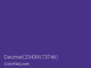 Decimal 23439173746 Color is a normal indigo color and the nearest color is Dark Slate Blue #483d8b. Hex code #483288 and RGB value is rgb(72,50,136). In RGB color space, this color is composed of 28% red, 20% green, 53% blue, In CMYK color space, this color is composed of 47% cyan, 63% magenta, 0% yellow , 47% black , In HSL color space, this color has a hue angle of 255° , 46% saturation and 36% lightness.