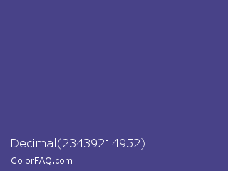 Decimal 23439214952 Color is a normal indigo color and the nearest color is Dark Slate Blue #483d8b. Hex code #484288 and RGB value is rgb(72,66,136). In RGB color space, this color is composed of 28% red, 26% green, 53% blue, In CMYK color space, this color is composed of 47% cyan, 51% magenta, 0% yellow , 47% black , In HSL color space, this color has a hue angle of 245° , 35% saturation and 40% lightness.