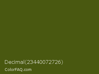 Decimal 23440072726 Color is a very dark lime color and the nearest color is Saratoga #555b10. Hex code #495810 and RGB value is rgb(73,88,16). In RGB color space, this color is composed of 29% red, 35% green, 6% blue, In CMYK color space, this color is composed of 17% cyan, 0% magenta, 82% yellow , 65% black , In HSL color space, this color has a hue angle of 73° , 69% saturation and 20% lightness.