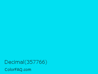 Decimal 357766 Color is a normal cyan color and the nearest color is Bright Turquoise #08e8de. Hex code #00e0f2 and RGB value is rgb(0,224,242). In RGB color space, this color is composed of 0% red, 88% green, 95% blue, In CMYK color space, this color is composed of 100% cyan, 7% magenta, 0% yellow , 5% black , In HSL color space, this color has a hue angle of 184° , 100% saturation and 47% lightness.