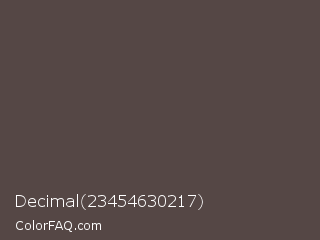 Decimal 23454630217 Color is a dark red color and the nearest color is Emperor #514649. Hex code #554745 and RGB value is rgb(85,71,69). In RGB color space, this color is composed of 33% red, 28% green, 27% blue, In CMYK color space, this color is composed of 0% cyan, 16% magenta, 19% yellow , 67% black , In HSL color space, this color has a hue angle of 8° , 10% saturation and 30% lightness.