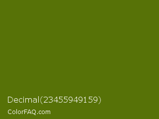 Decimal 23455949159 Color is a dark lime color and the nearest color is Avocado #568203. Hex code #577207 and RGB value is rgb(87,114,7). In RGB color space, this color is composed of 34% red, 45% green, 3% blue, In CMYK color space, this color is composed of 24% cyan, 0% magenta, 94% yellow , 55% black , In HSL color space, this color has a hue angle of 75° , 88% saturation and 24% lightness.