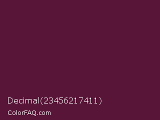 Decimal 23456217411 Color is a very dark rose color and the nearest color is Wine Berry #591d35. Hex code #581537 and RGB value is rgb(88,21,55). In RGB color space, this color is composed of 35% red, 8% green, 22% blue, In CMYK color space, this color is composed of 0% cyan, 76% magenta, 38% yellow , 65% black , In HSL color space, this color has a hue angle of 330° , 61% saturation and 21% lightness.