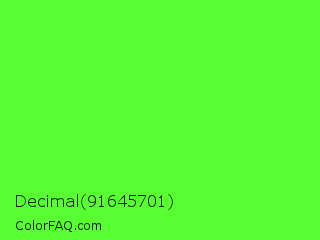 Decimal 91645701 Color is a normal green color and the nearest color is Neon Green #39ff14. Hex code #57fe31 and RGB value is rgb(87,254,49). In RGB color space, this color is composed of 34% red, 100% green, 19% blue, In CMYK color space, this color is composed of 66% cyan, 0% magenta, 81% yellow , 0% black , In HSL color space, this color has a hue angle of 109° , 99% saturation and 59% lightness.