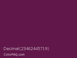Decimal 23462445719 Color is a dark magenta color and the nearest color is Tawny Port #692545. Hex code #611749 and RGB value is rgb(97,23,73). In RGB color space, this color is composed of 38% red, 9% green, 29% blue, In CMYK color space, this color is composed of 0% cyan, 76% magenta, 25% yellow , 62% black , In HSL color space, this color has a hue angle of 319° , 62% saturation and 24% lightness.