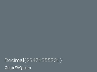 Decimal 23471355701 Color is a normal blue color and the nearest color is Nevada #646e75. Hex code #647077 and RGB value is rgb(100,112,119). In RGB color space, this color is composed of 39% red, 44% green, 47% blue, In CMYK color space, this color is composed of 16% cyan, 6% magenta, 0% yellow , 53% black , In HSL color space, this color has a hue angle of 202° , 9% saturation and 43% lightness.
