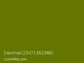 Decimal 23471362386 Color is a dark yellow color and the nearest color is Bronze Yellow #737000. Hex code #647600 and RGB value is rgb(100,118,0). In RGB color space, this color is composed of 39% red, 46% green, 0% blue, In CMYK color space, this color is composed of 15% cyan, 0% magenta, 100% yellow , 54% black , In HSL color space, this color has a hue angle of 69° , 100% saturation and 23% lightness.