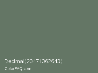 Decimal 23471362643 Color is a normal green color and the nearest color is Willow Grove #65745d. Hex code #647665 and RGB value is rgb(100,118,101). In RGB color space, this color is composed of 39% red, 46% green, 40% blue, In CMYK color space, this color is composed of 15% cyan, 0% magenta, 14% yellow , 54% black , In HSL color space, this color has a hue angle of 123° , 8% saturation and 43% lightness.