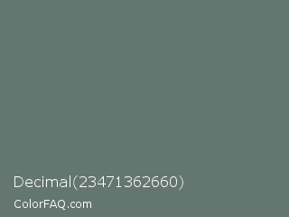 Decimal 23471362660 Color is a normal green color and the nearest color is Nevada #646e75. Hex code #647670 and RGB value is rgb(100,118,112). In RGB color space, this color is composed of 39% red, 46% green, 44% blue, In CMYK color space, this color is composed of 15% cyan, 0% magenta, 5% yellow , 54% black , In HSL color space, this color has a hue angle of 160° , 8% saturation and 43% lightness.