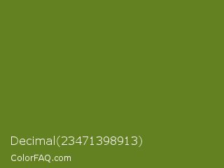 Decimal 23471398913 Color is a normal lime color and the nearest color is Olive Drab #6b8e23. Hex code #648121 and RGB value is rgb(100,129,33). In RGB color space, this color is composed of 39% red, 51% green, 13% blue, In CMYK color space, this color is composed of 22% cyan, 0% magenta, 74% yellow , 49% black , In HSL color space, this color has a hue angle of 78° , 59% saturation and 32% lightness.