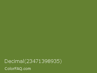 Decimal 23471398935 Color is a normal green color and the nearest color is Maximum Green #5e8c31. Hex code #648131 and RGB value is rgb(100,129,49). In RGB color space, this color is composed of 39% red, 51% green, 19% blue, In CMYK color space, this color is composed of 22% cyan, 0% magenta, 62% yellow , 49% black , In HSL color space, this color has a hue angle of 82° , 45% saturation and 35% lightness.
