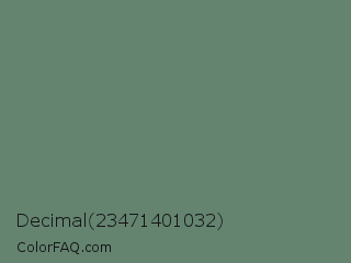 Decimal 23471401032 Color is a normal green color and the nearest color is Viridian Green #678975. Hex code #648470 and RGB value is rgb(100,132,112). In RGB color space, this color is composed of 39% red, 52% green, 44% blue, In CMYK color space, this color is composed of 24% cyan, 0% magenta, 15% yellow , 48% black , In HSL color space, this color has a hue angle of 143° , 14% saturation and 45% lightness.