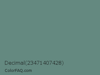 Decimal 23471407428 Color is a normal cyan color and the nearest color is Viridian Green #678975. Hex code #648980 and RGB value is rgb(100,137,128). In RGB color space, this color is composed of 39% red, 54% green, 50% blue, In CMYK color space, this color is composed of 27% cyan, 0% magenta, 7% yellow , 46% black , In HSL color space, this color has a hue angle of 165° , 16% saturation and 46% lightness.