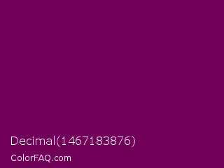 Decimal 1467183876 Color is a very dark magenta color and the nearest color is Pompadour #660045. Hex code #710058 and RGB value is rgb(113,0,88). In RGB color space, this color is composed of 44% red, 0% green, 35% blue, In CMYK color space, this color is composed of 0% cyan, 100% magenta, 22% yellow , 56% black , In HSL color space, this color has a hue angle of 313° , 100% saturation and 22% lightness.