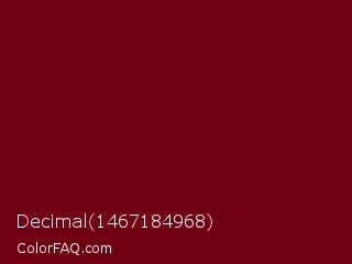 Decimal 1467184968 Color is a dark red color and the nearest color is Venetian Red #72010f. Hex code #710214 and RGB value is rgb(113,2,20). In RGB color space, this color is composed of 44% red, 1% green, 8% blue, In CMYK color space, this color is composed of 0% cyan, 98% magenta, 82% yellow , 56% black , In HSL color space, this color has a hue angle of 350° , 97% saturation and 23% lightness.