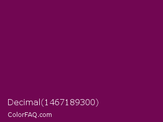 Decimal 1467189300 Color is a dark magenta color and the nearest color is Pompadour #660045. Hex code #710652 and RGB value is rgb(113,6,82). In RGB color space, this color is composed of 44% red, 2% green, 32% blue, In CMYK color space, this color is composed of 0% cyan, 95% magenta, 27% yellow , 56% black , In HSL color space, this color has a hue angle of 317° , 90% saturation and 23% lightness.