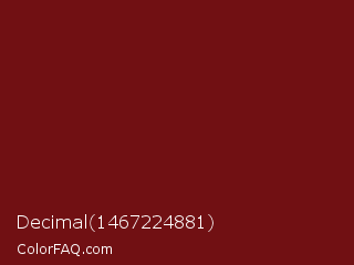 Decimal 1467224881 Color is a dark red color and the nearest color is UP Maroon #7b1113. Hex code #711013 and RGB value is rgb(113,16,19). In RGB color space, this color is composed of 44% red, 6% green, 7% blue, In CMYK color space, this color is composed of 0% cyan, 86% magenta, 83% yellow , 56% black , In HSL color space, this color has a hue angle of 358° , 75% saturation and 25% lightness.