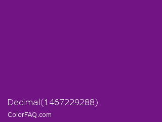 Decimal 1467229288 Color is a dark purple color and the nearest color is Seance #731e8f. Hex code #711484 and RGB value is rgb(113,20,132). In RGB color space, this color is composed of 44% red, 8% green, 52% blue, In CMYK color space, this color is composed of 14% cyan, 85% magenta, 0% yellow , 48% black , In HSL color space, this color has a hue angle of 290° , 74% saturation and 30% lightness.
