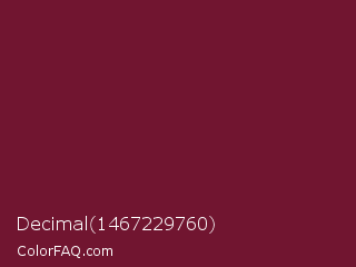 Decimal 1467229760 Color is a dark rose color and the nearest color is Claret #7f1734. Hex code #711530 and RGB value is rgb(113,21,48). In RGB color space, this color is composed of 44% red, 8% green, 19% blue, In CMYK color space, this color is composed of 0% cyan, 81% magenta, 58% yellow , 56% black , In HSL color space, this color has a hue angle of 342° , 69% saturation and 26% lightness.