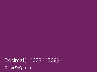 Decimal 1467244568 Color is a dark magenta color and the nearest color is Byzantium #702963. Hex code #712262 and RGB value is rgb(113,34,98). In RGB color space, this color is composed of 44% red, 13% green, 38% blue, In CMYK color space, this color is composed of 0% cyan, 70% magenta, 13% yellow , 56% black , In HSL color space, this color has a hue angle of 311° , 54% saturation and 29% lightness.