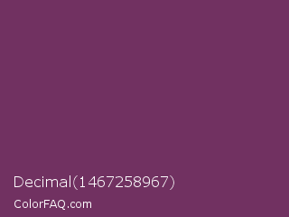 Decimal 1467258967 Color is a normal magenta color and the nearest color is Byzantium #702963. Hex code #713161 and RGB value is rgb(113,49,97). In RGB color space, this color is composed of 44% red, 19% green, 38% blue, In CMYK color space, this color is composed of 0% cyan, 57% magenta, 14% yellow , 56% black , In HSL color space, this color has a hue angle of 315° , 40% saturation and 32% lightness.