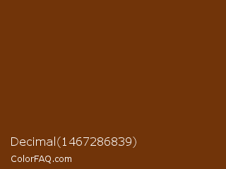 Decimal 1467286839 Color is a dark orange color and the nearest color is Nutmeg Wood Finish #683600. Hex code #713409 and RGB value is rgb(113,52,9). In RGB color space, this color is composed of 44% red, 20% green, 4% blue, In CMYK color space, this color is composed of 0% cyan, 54% magenta, 92% yellow , 56% black , In HSL color space, this color has a hue angle of 25° , 85% saturation and 24% lightness.