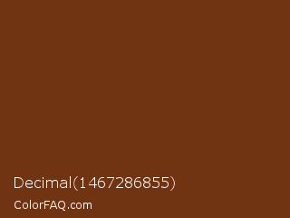 Decimal 1467286855 Color is a dark orange color and the nearest color is Peanut #782f16. Hex code #713413 and RGB value is rgb(113,52,19). In RGB color space, this color is composed of 44% red, 20% green, 7% blue, In CMYK color space, this color is composed of 0% cyan, 54% magenta, 83% yellow , 56% black , In HSL color space, this color has a hue angle of 21° , 71% saturation and 26% lightness.