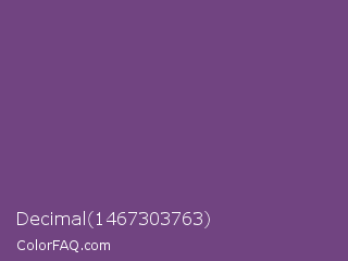 Decimal 1467303763 Color is a normal purple color and the nearest color is Maximum Purple #733380. Hex code #714481 and RGB value is rgb(113,68,129). In RGB color space, this color is composed of 44% red, 27% green, 51% blue, In CMYK color space, this color is composed of 12% cyan, 47% magenta, 0% yellow , 49% black , In HSL color space, this color has a hue angle of 284° , 31% saturation and 39% lightness.