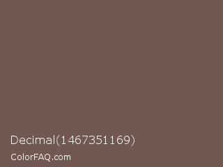 Decimal 1467351169 Color is a normal color and the nearest color is Pine Cone #6d5e54. Hex code #715951 and RGB value is rgb(113,89,81). In RGB color space, this color is composed of 44% red, 35% green, 32% blue, In CMYK color space, this color is composed of 0% cyan, 21% magenta, 28% yellow , 56% black , In HSL color space, this color has a hue angle of 15° , 16% saturation and 38% lightness.